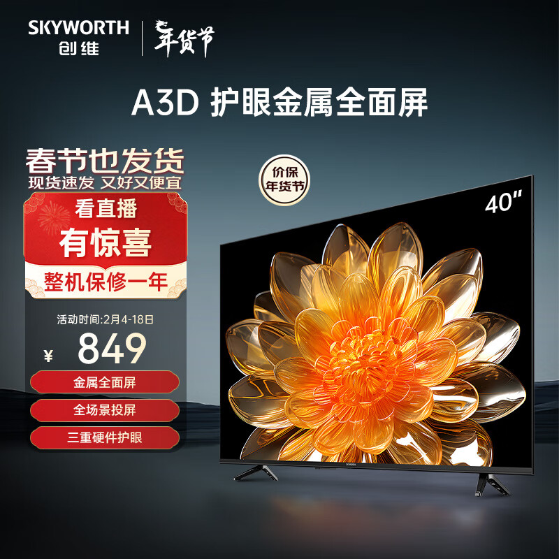 创维电视40A3D 40英寸电视机金属屏智能投屏三重硬件护眼平板液晶家用彩电43 32价格:849.00元!