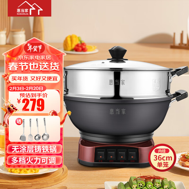 惠当家(Hui Dang Jia)电炒锅多功能电热锅电锅定时电蒸锅一体加厚铸铁锅电煮锅多用途锅 铸铁锅身-36cm单笼【按键款】价格:298.00元!