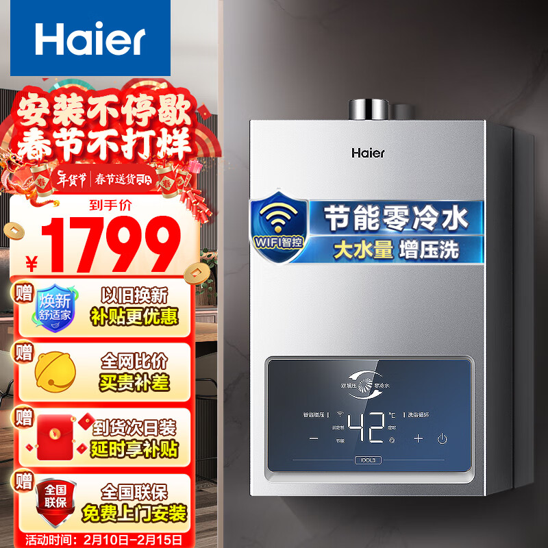 海尔(Haier)16升燃气热水器天然气大水量增压洗零冷水 AI自学习节能家用WIFI遥控智能防冻 JSQ30-16IDOL3-TU1价格:1999.00元!