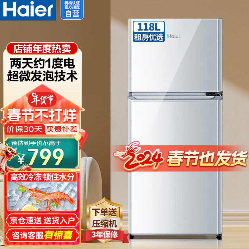 海尔(Haier)冰箱118升二门双开门迷你小冰箱节能省电家用超薄租房宿舍冷藏冷冻家电小型直冷电冰箱BCD-118TMPA价格:799.00元!