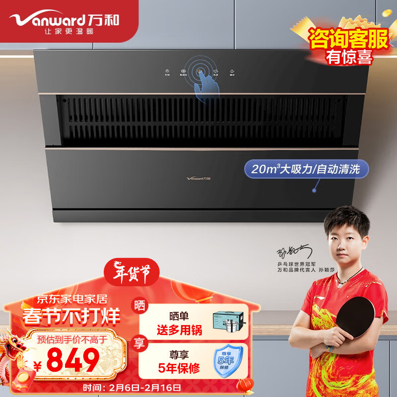 万和(Vanward)侧吸式抽油烟机 20立方米大吸力 自清洗 家用吸油烟机 钢化玻璃大面板 J525S价格:849.00元!