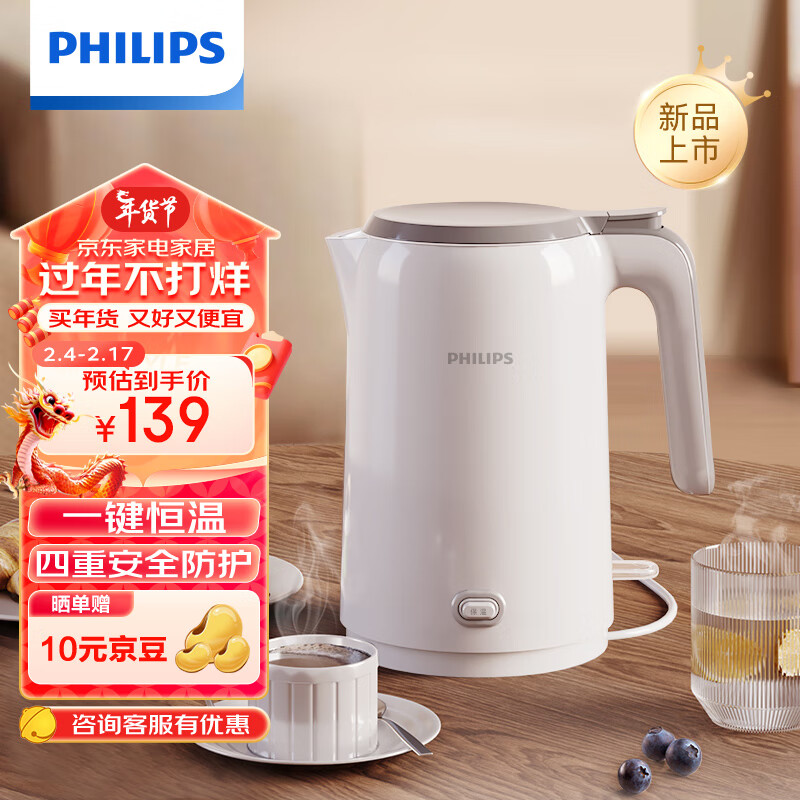 飞利浦(PHILIPS)恒温电水壶 家用大功率热水壶 一键保温 304不锈钢1.5L 双层防烫烧水壶HD9366价格:139.00元!
