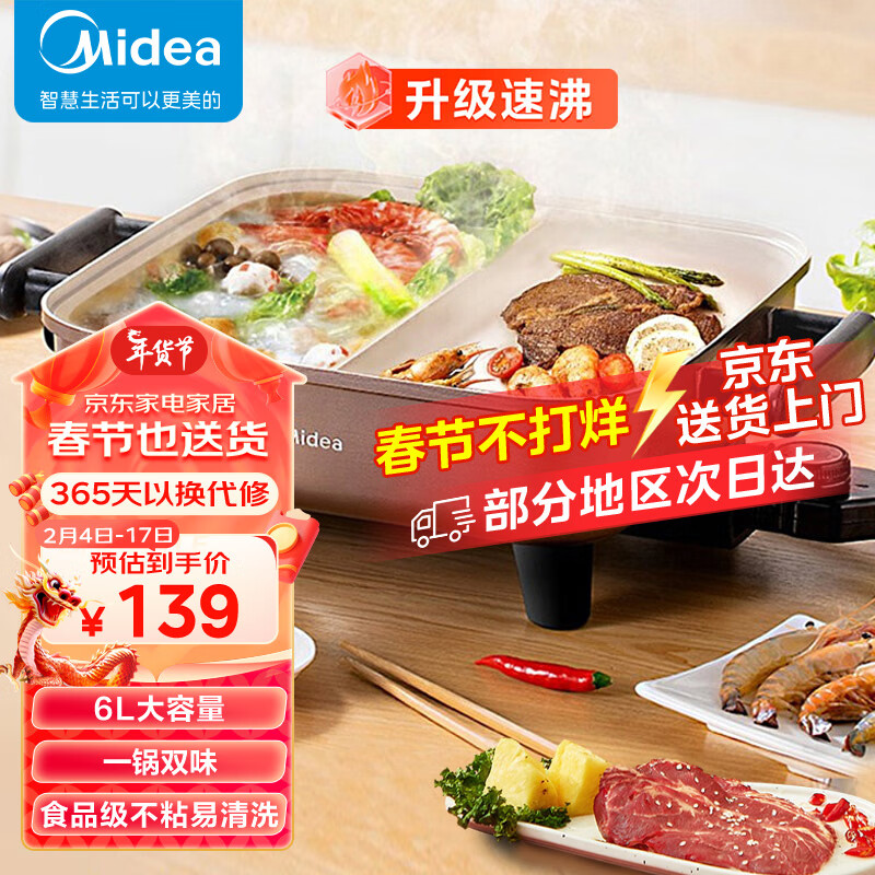美的(Midea)电火锅 鸳鸯锅 火锅专用锅 电炒锅 电煮锅 电锅煎烤涮肉一体锅 多功能锅6L火锅锅 DY3030Easy102价格:139.00元!