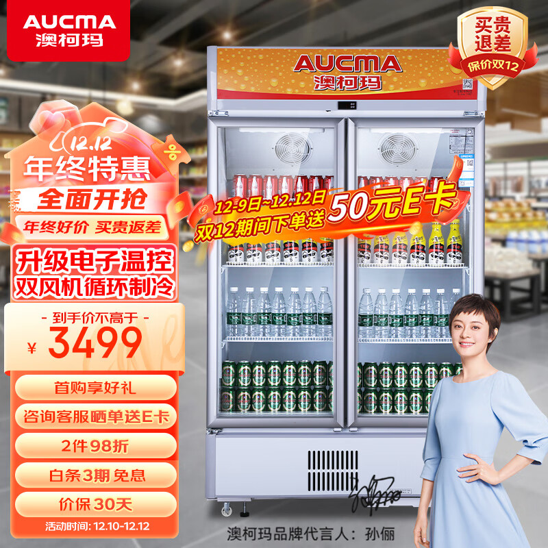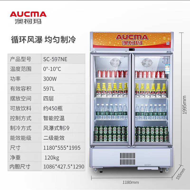 澳柯玛(AUCMA)597升商用立式双门风直冷冷柜 啤酒饮料冷藏保鲜展示柜 玻璃门陈列柜 SC-597NE价格:3499.00元!