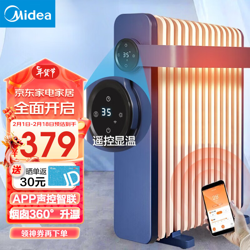 美的(Midea)取暖器 电热油汀 电暖器 APP+声控电暖气片 暖风机家用 烟囱360°升温无光轻音加湿烘衣暖脚烤火炉 【智能互联】22KRA价格:549.00元!