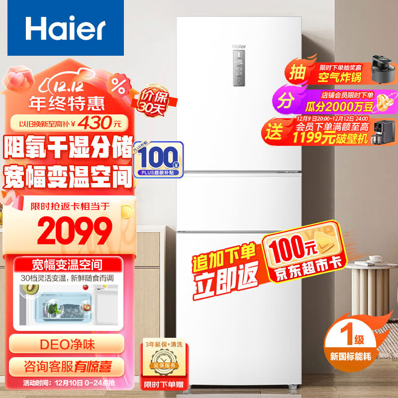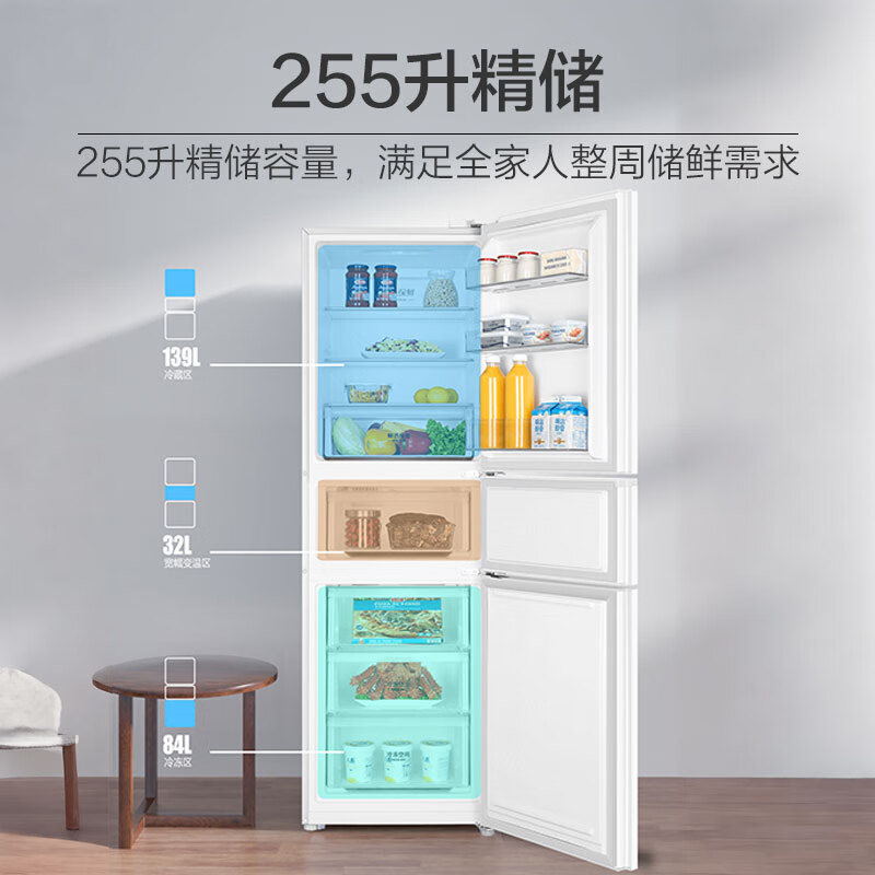 海尔(Haier)255升风冷无霜三开门多门电冰箱小户型家用宿舍出租房一级能效节能中门变温BCD-255WLHC35EWVU1价格:2199.00元!