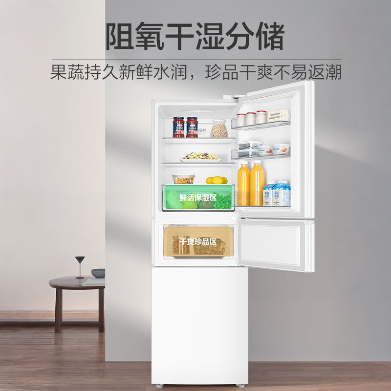 3、冰箱目前用的还可以,没有噪音。制冷效果也比较好,能放下不少东西。中间还有可以调节温度的保鲜空间。冰箱的尺寸也很不错,刚好能放下!小厨房真的很需要这种小尺寸的冰箱!