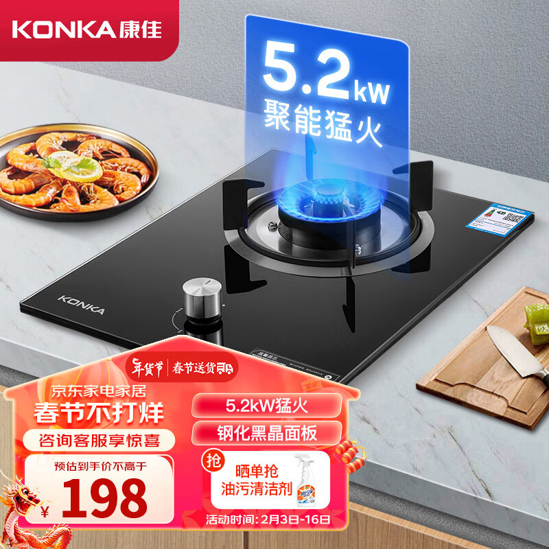 康佳(KONKA)燃气灶单眼灶具 5.2kW家用大火力灶 台式/嵌入式一级能效玻璃灶台 JZT-D431Y(天然气)价格:198.00元!