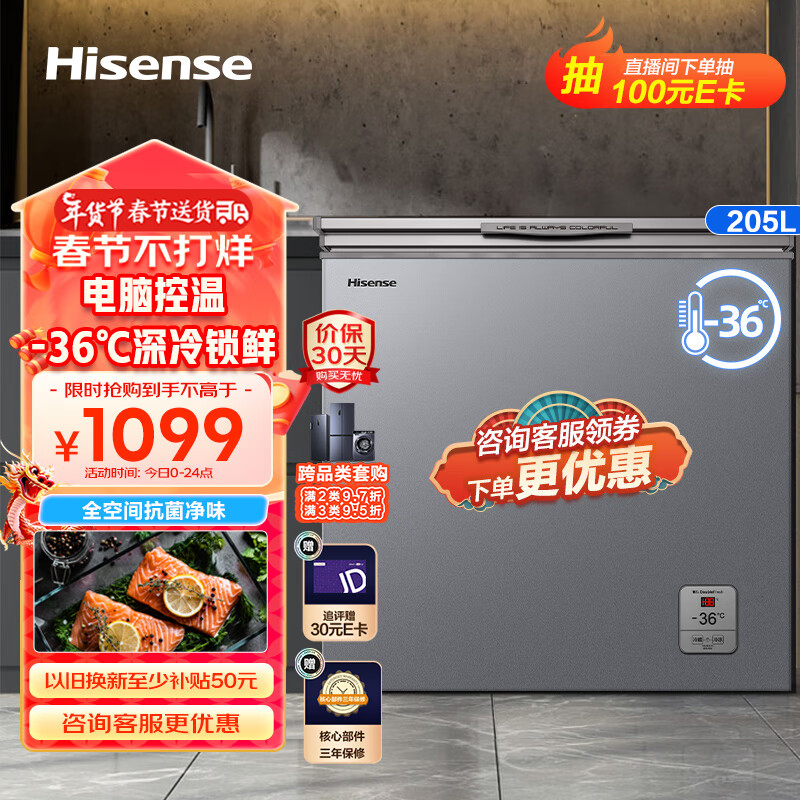 海信(Hisense) 205升减霜冰柜家用商用电子控温 -36℃冷藏冷冻转换冷柜 一级节能顶开门BD/BC-205ZNUTB以旧换新价格:1099.00元!