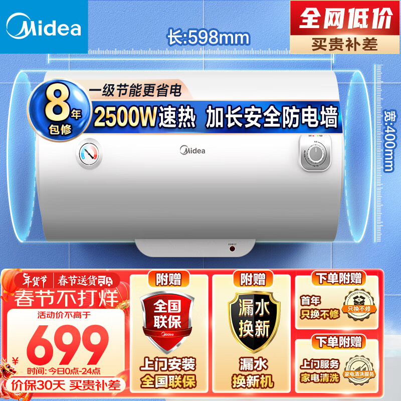 美的(Midea)电热水器2500W速热一级能效40升家用节能省电加长防电墙漏电提醒小型储水式洗澡F4025-A5(HE)价格:699.00元!