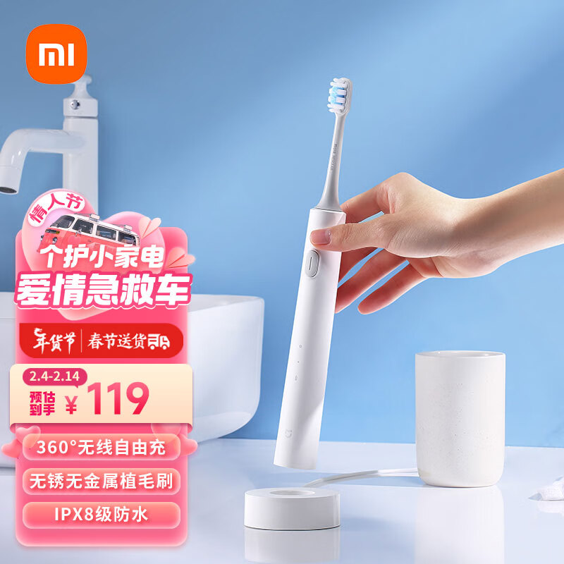 米家 小米电动牙刷 声波震动 两档模式 无线充电 闪充应急 50天续航 T301 情人节礼物推荐价格:119.00元!