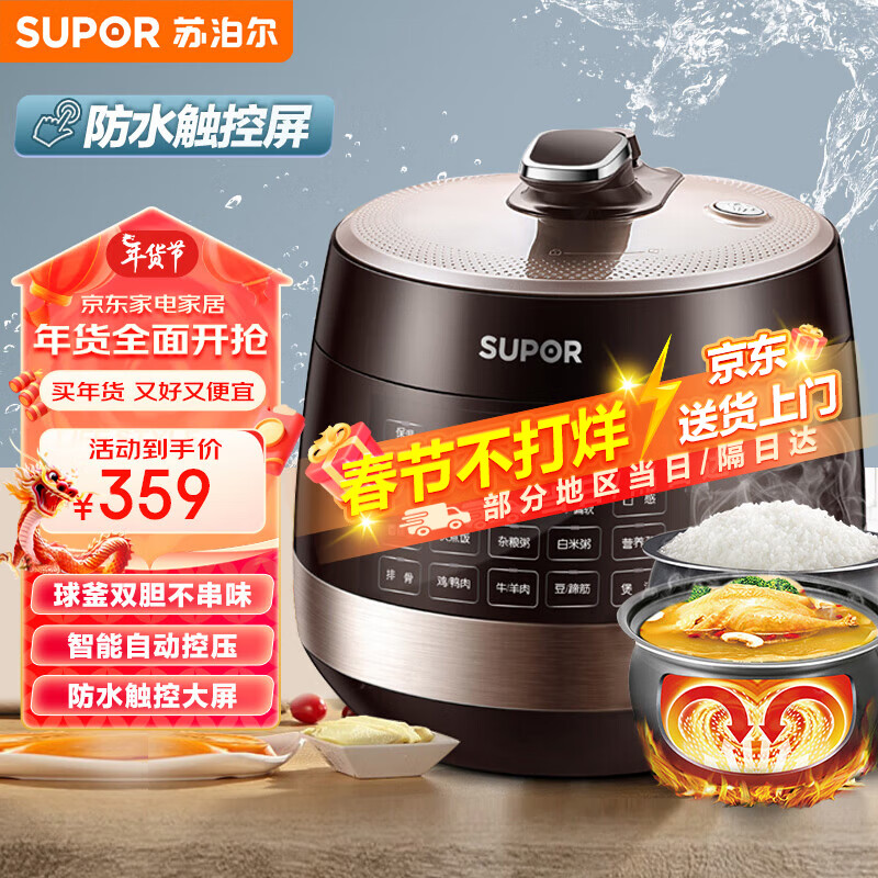 苏泊尔(SUPOR)全自动智能预约电锅5L 触控面板家用煲汤保温易清洁双球釜内胆SY-50YC9001Q电饭煲高压锅3-6人价格:359.00元!