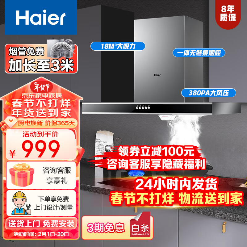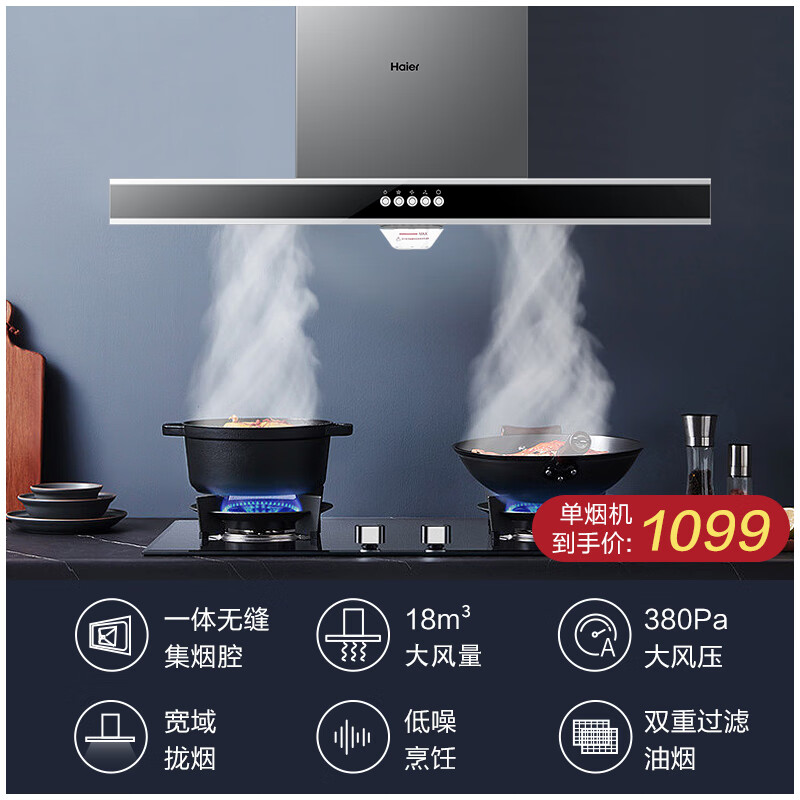 海尔(Haier)油烟机 欧式顶吸抽油烟机家用18立方大吸力 一级能效三档调速 吸脱排油烟机CXW-200-E900T6V[家电]价格:1099.00元!