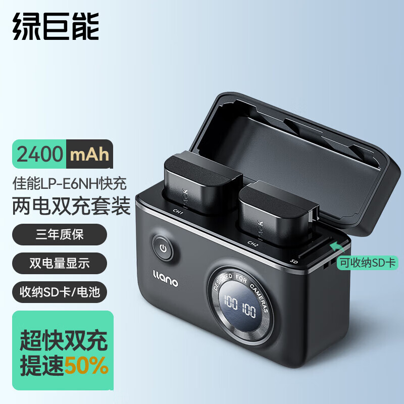 绿巨能(llano)佳能LP-E6NH相机快充盒R6电池5D4/5d3/R5/80d/70d/6D2/90d单反电池可收纳双充数显充电器两电双充价格:509.00元!
