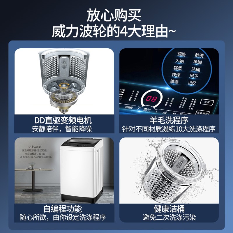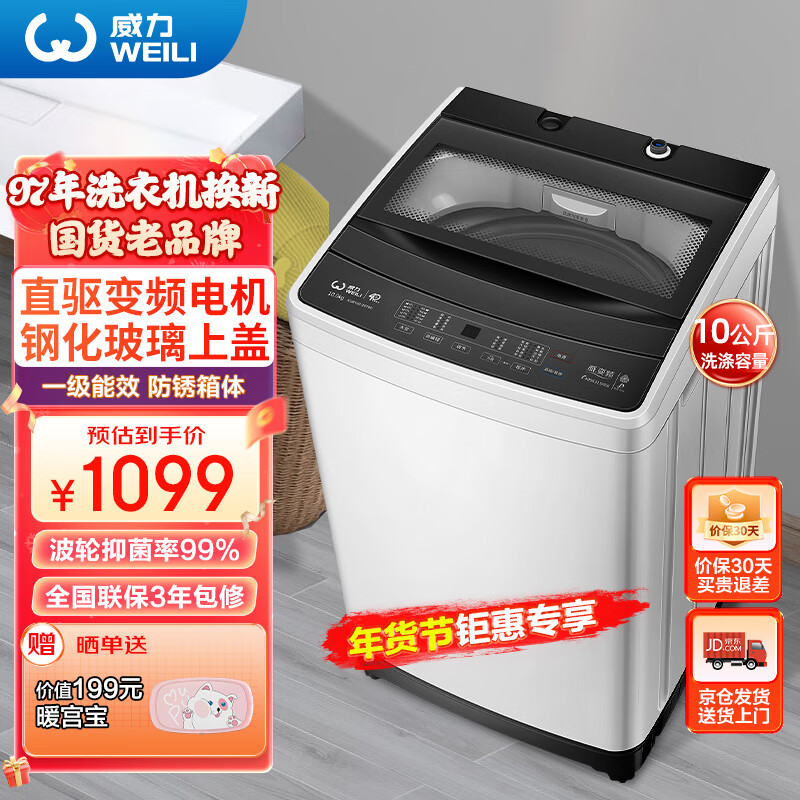 威力(WEILI)波轮洗衣机全自动 10公斤直驱变频 大容量玻璃盖阻尼 一级能效自判水位(雅白色)XQB100-2079D价格:1099.00元!