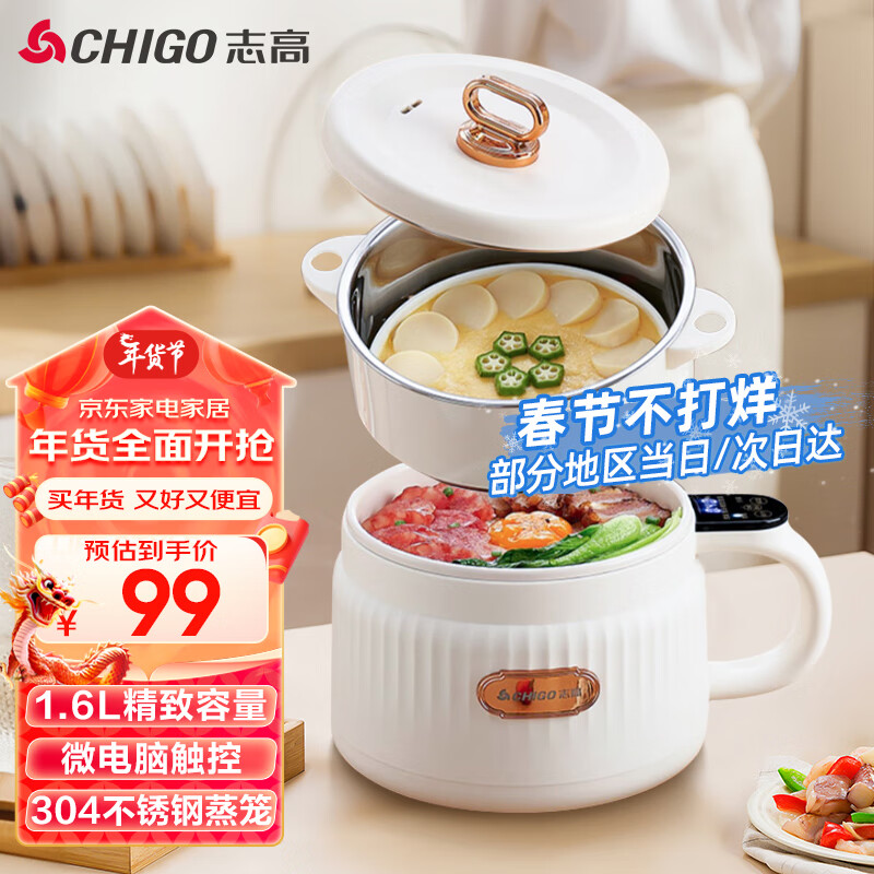 志高(CHIGO)电煮锅 电饭锅迷你电饭煲1-2人 电蒸锅 学生宿舍一体泡面电火锅多功能锅1.6L配304不锈钢蒸笼价格:99.00元!