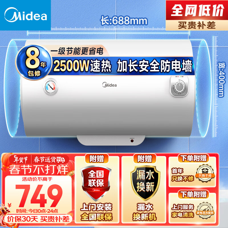 美的(Midea)电热水器2500W速热家用一级能效50升节能省电加长防电墙漏电提醒小型储水式洗澡F5025-A5(HE)价格:749.00元!