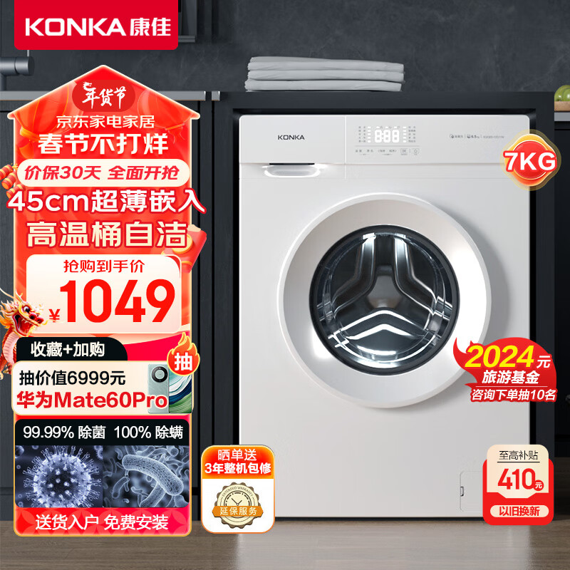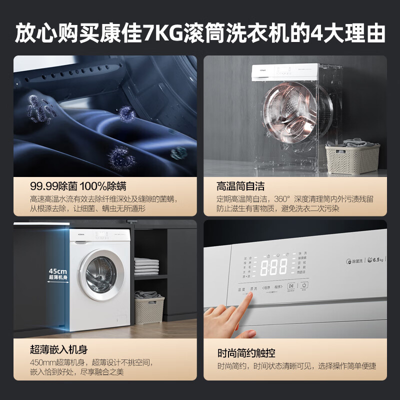 康佳(KONKA)7公斤超薄全自动滚筒洗衣机 宿舍租户小型迷你便捷 90°高温除菌 100%除螨 KG70-1005价格:1049.00元!