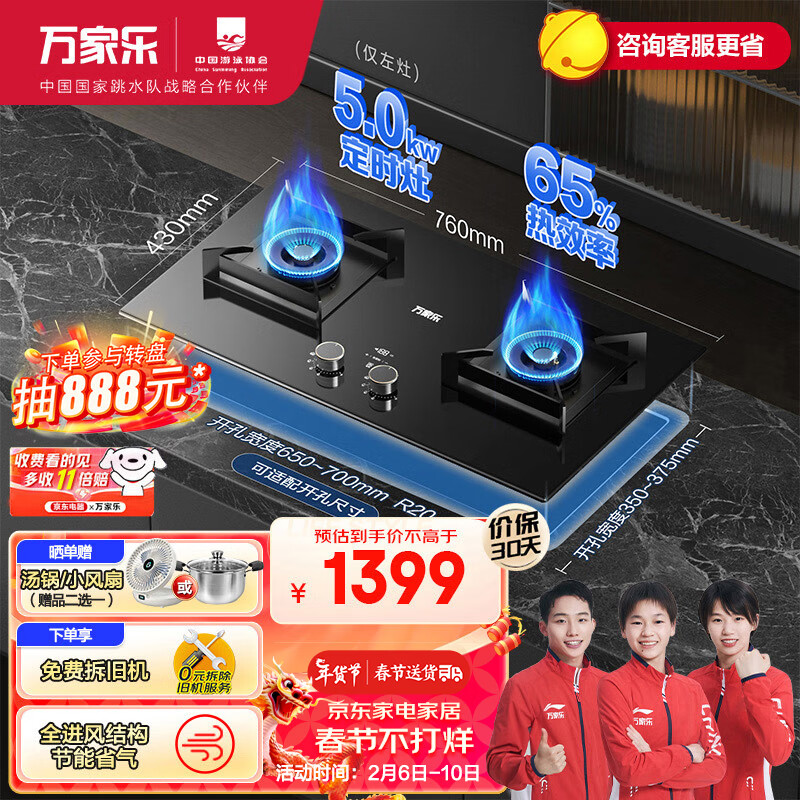 万家乐燃气灶 5.0kw大火力煤气灶双灶 智能定时灶嵌入式烟灶联动全进风台嵌两用可调节开孔JZY-AY9液化气价格:1499.00元!
