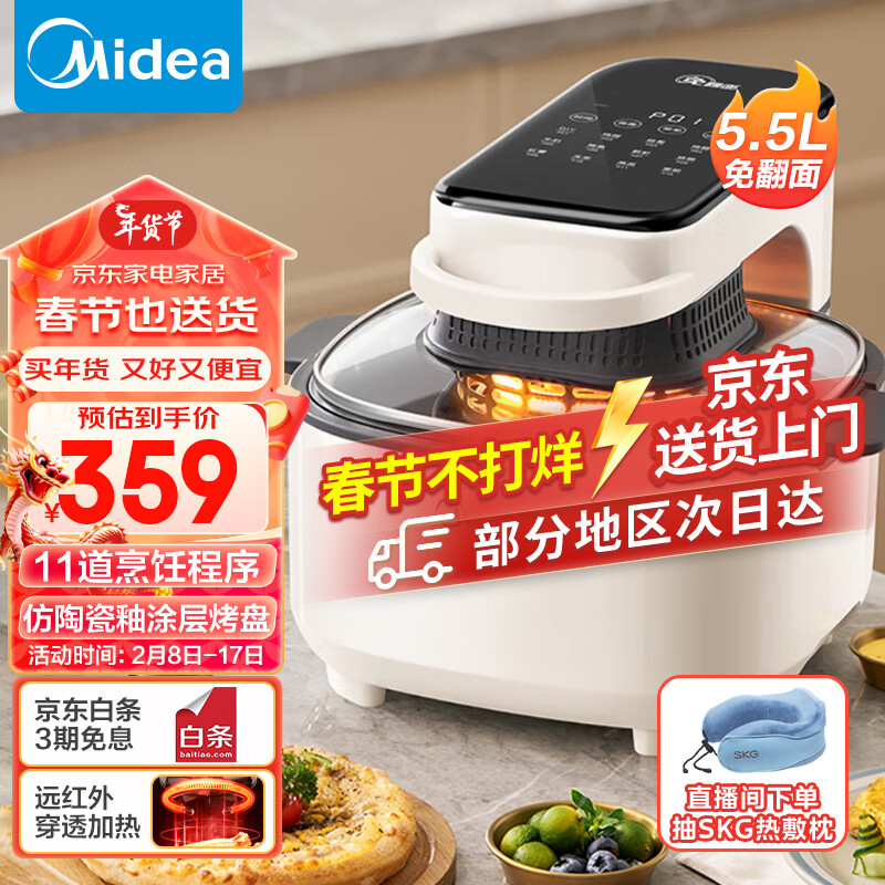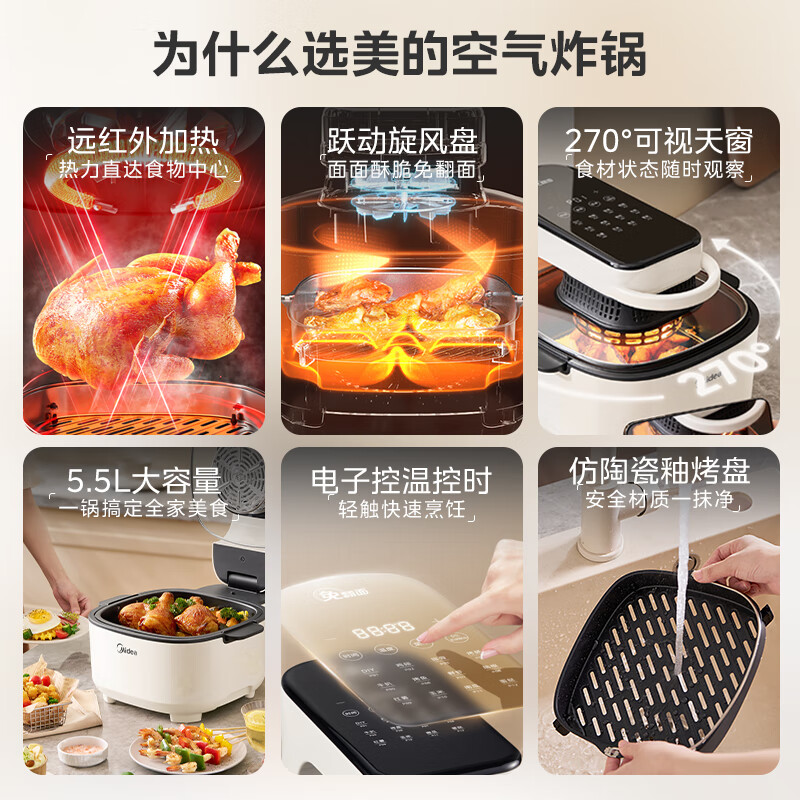 美的(Midea)空气炸锅 免翻面 可视 家用大容量 5.5L 炸烤箱一体 多功能 不沾易洗 不用翻面 MF-KZC551J5价格:389.00元!