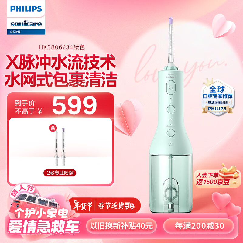 飞利浦家用立式冲牙器男/女立式手持2种洁齿模式3级洁齿力度美牙舱HX3806/34 绿色新年 情人节礼物价格:689.00元!