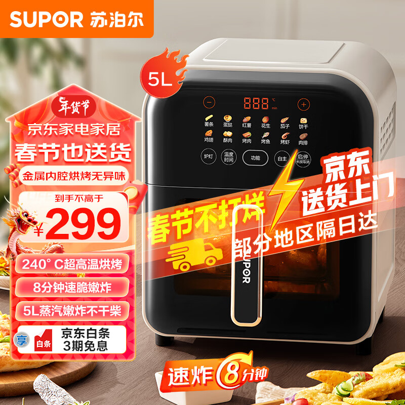 苏泊尔(SUPOR)免翻面 空气炸锅 240°超高温加热 5L家用大容量 智能触控 蒸汽嫩炸 可视 不用翻面炸锅KD50D863价格:299.00元!