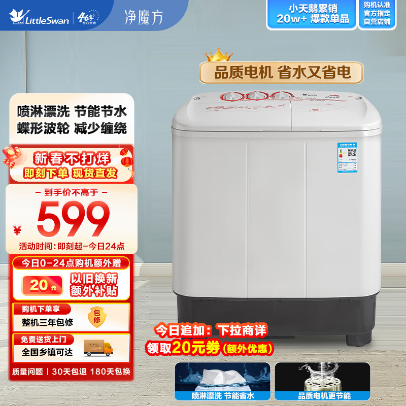 小天鹅(LittleSwan)双桶双缸洗衣机半自动 8公斤家电 喷淋漂洗强力去污 以旧换新 操作简便 租房家用 TP80VDS08价格:579.00元!