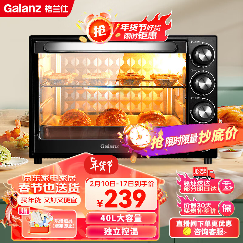 格兰仕(Galanz)40L家用大容量多功能电烤箱 独立控温/机械操控/多层烤位/多功能烘焙带炉灯K40价格:239.00元!