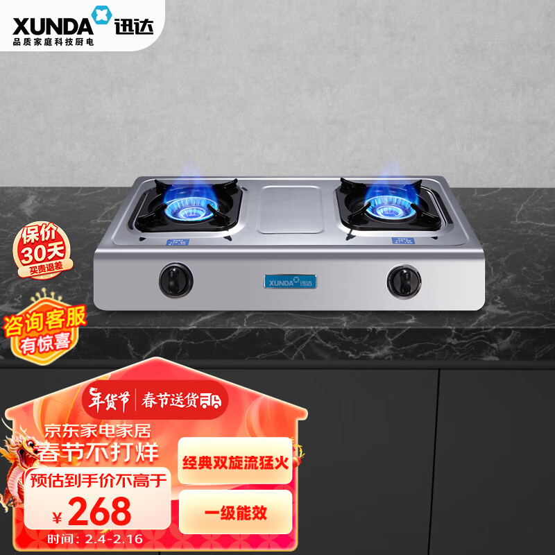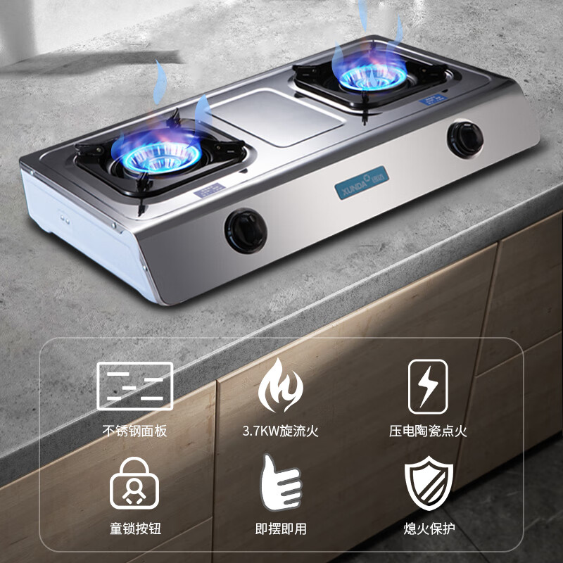迅达(XUNDA)燃气灶液化气灶家用 台式煤气灶双灶具 旋流猛火炉灶 不锈钢面板 66%热效率 DS108-液化气价格:268.00元!