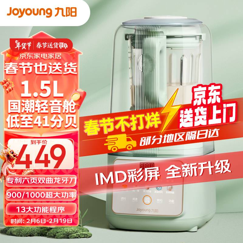 九阳(Joyoung)轻音舱43分贝1.5升低音破壁机家用豆浆机 柔音降噪榨汁机料理机辅食机国潮轻音L15-P919价格:399.00元!