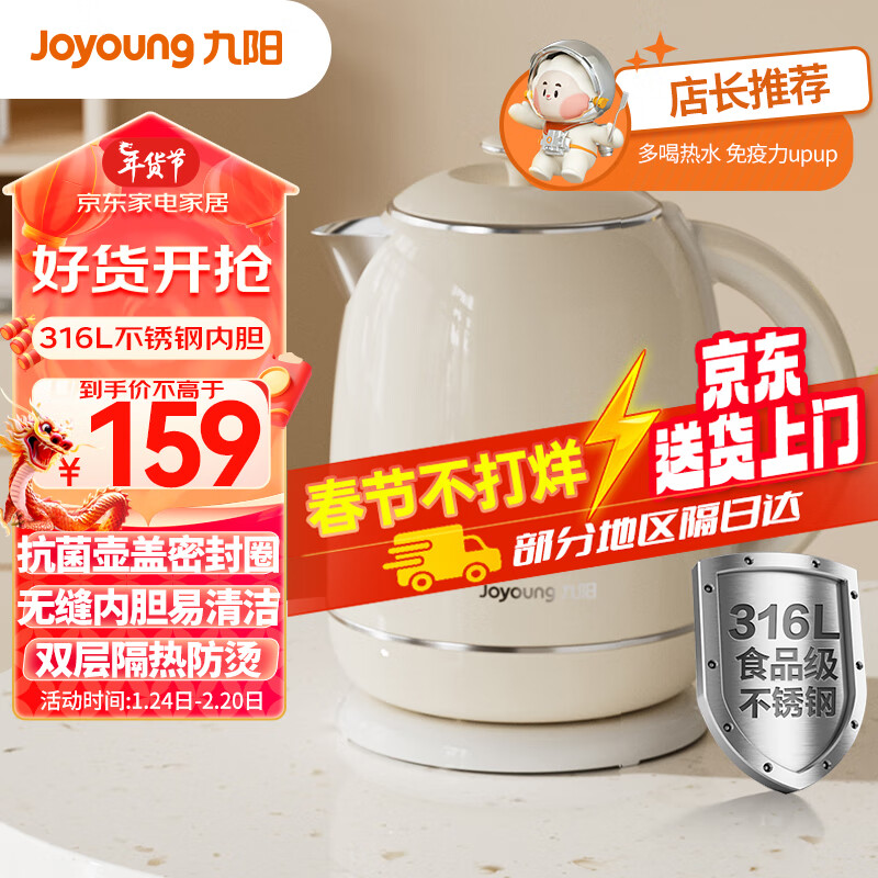 九阳(Joyoung)热水壶烧水壶电水壶1.5L 双层隔热316L不锈钢无缝内胆 轻复古家用开水壶K15FD-W582价格:159.00元!
