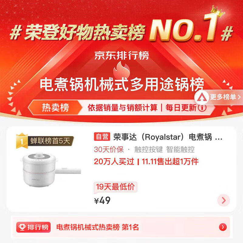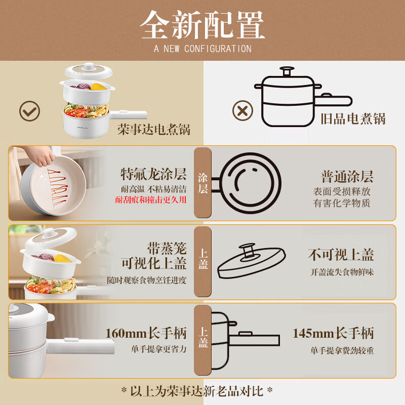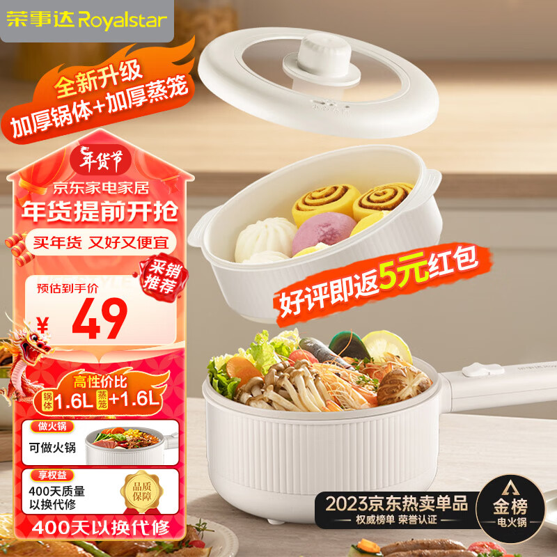 荣事达(Royalstar)电煮锅 家用多功能学生宿舍泡面电火锅蒸煮煎炒锅电热锅小电锅电炒锅带蒸笼 机械+蒸笼DZG16A价格:49.00元!
