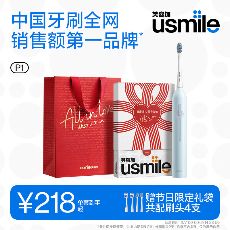 usmile笑容加 成人电动牙刷 P1精灵蓝+缓震亮白刷头2支装价格:299.00元!