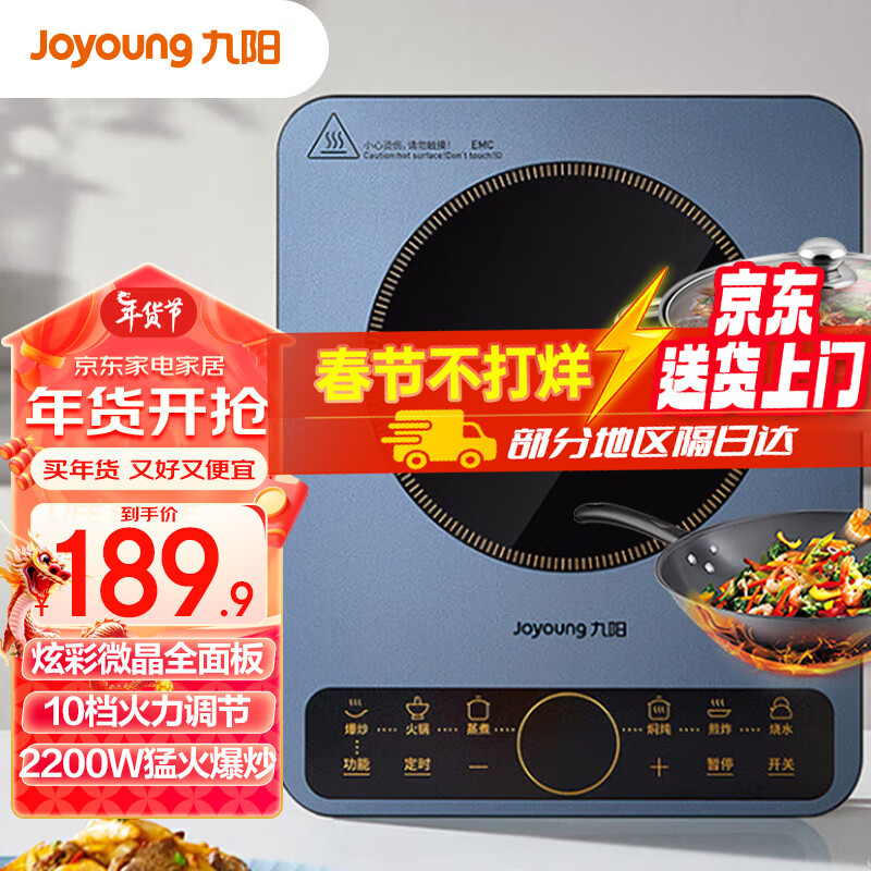 九阳(Joyoung)电磁炉套装电磁灶电池炉2200W家用带锅一键爆炒定时功能年货送长辈送老人C22S-N410-A1配汤锅炒锅价格:189.90元!