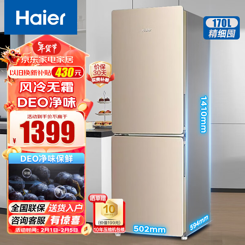 海尔(Haier)冰箱 小型双门170升风冷无霜 二门冷藏冷冻电冰箱家用迷你宿舍租房公寓两门小冰箱价格:1399.00元!