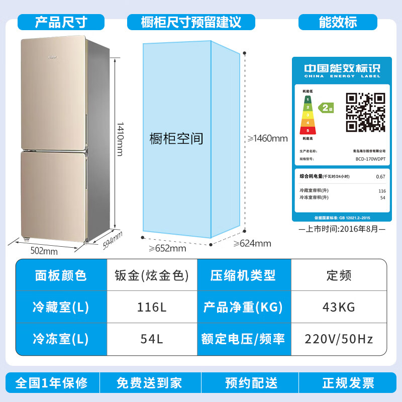 海尔BCD-170WDPT配置参数: