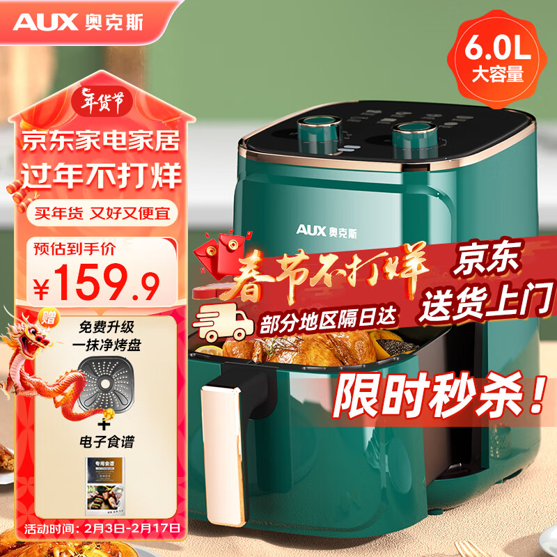 奥克斯(AUX)空气炸锅家用6L大容量精准定时无油烟电炸锅低脂薯条机不沾煎炸锅大功率烤箱薯条机年货节送长辈价格:159.90元!