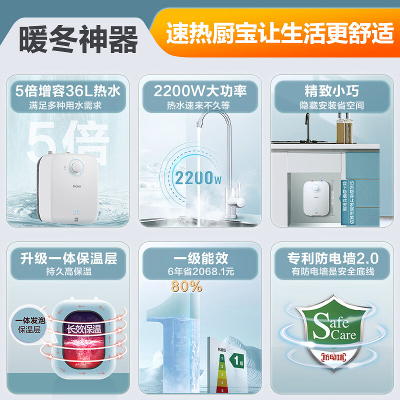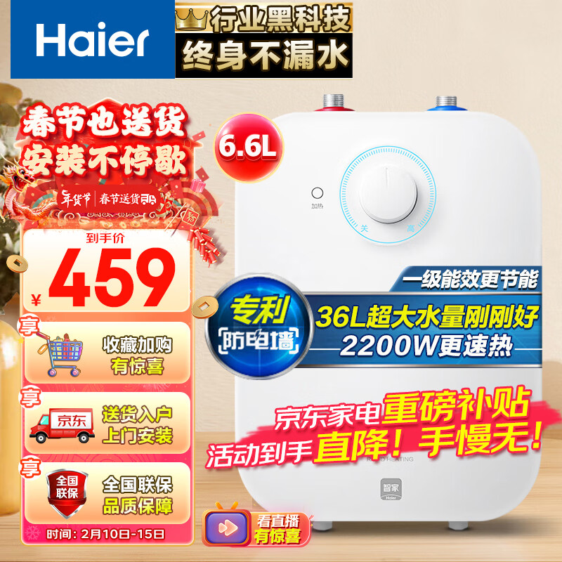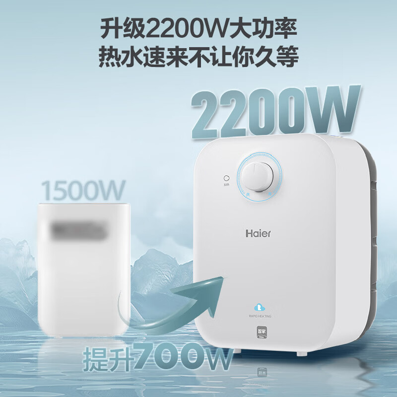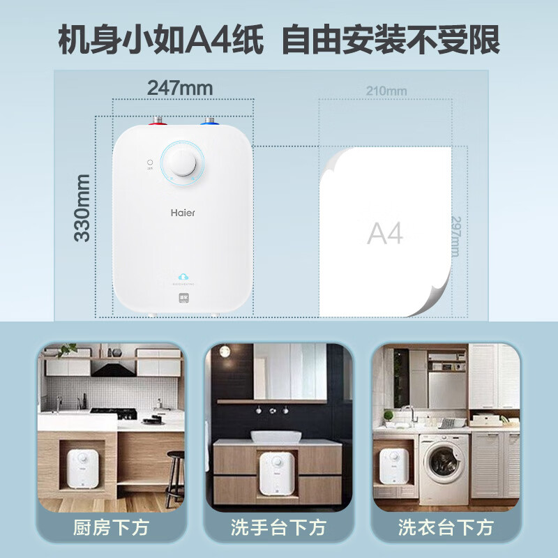 海尔(Haier)6.6升上出水小厨宝 2200W家用厨房速热电热水器 小巧尺寸一级能效节能 EC6.6FA价格:457.00元!