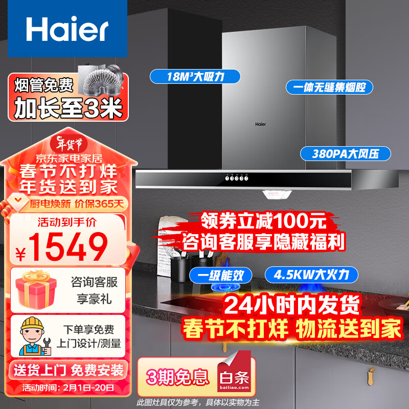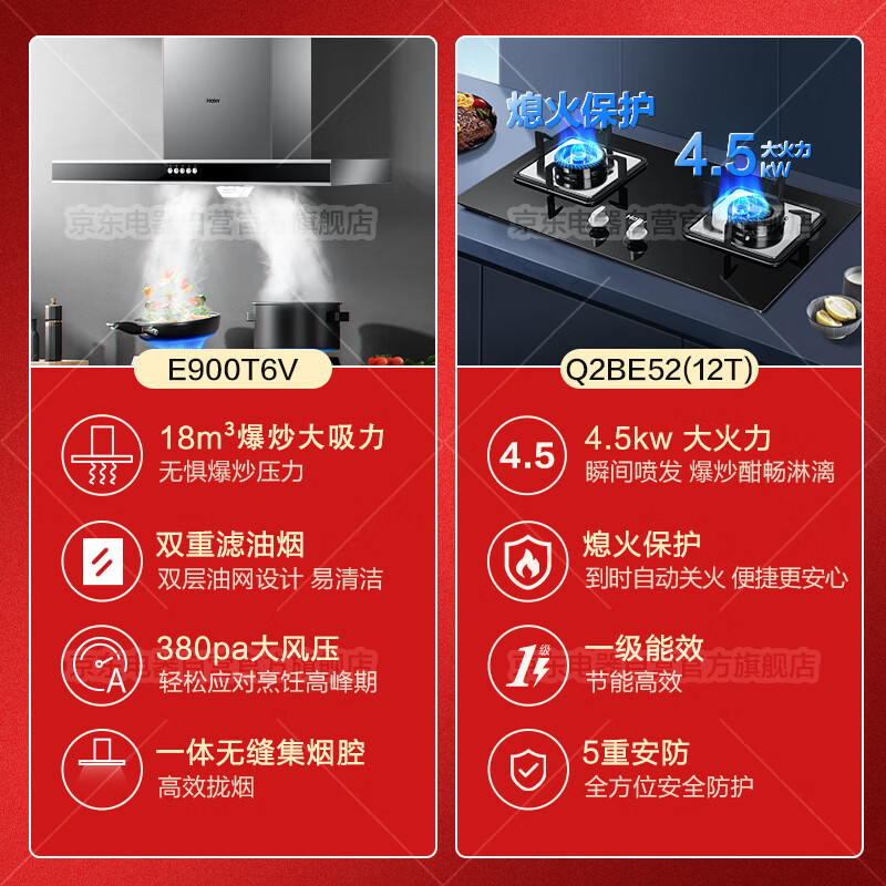 海尔(Haier)抽油烟机燃气灶套装 欧式顶吸一级能效 18m3大吸力吸油烟机家用 E900T6V烟灶套装4.5KW灶[家电]价格:1649.00元!