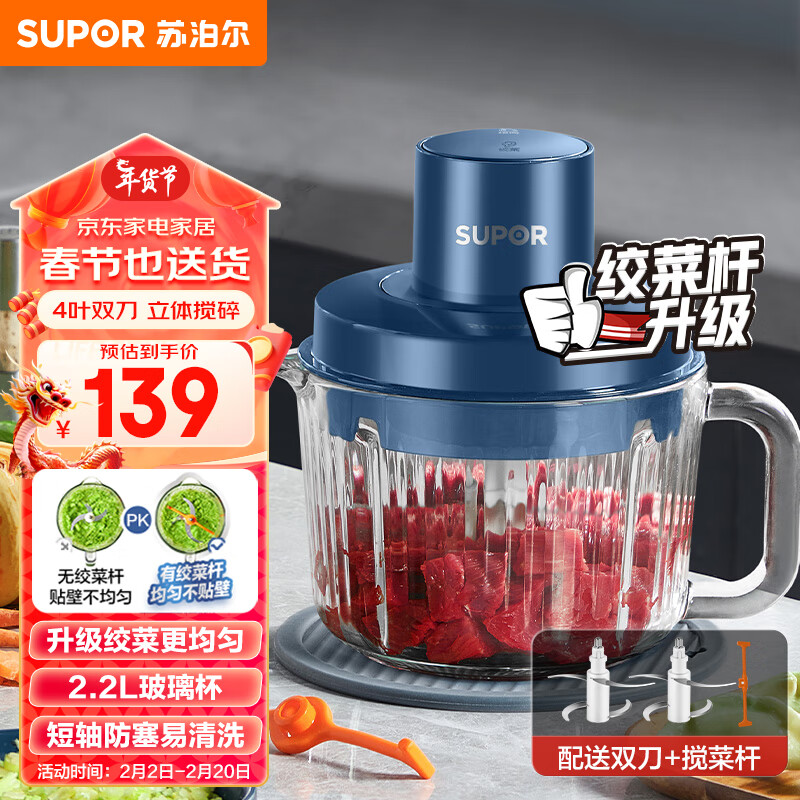 苏泊尔(SUPOR)绞肉机 双刀升级绞菜杆 家用多功能搅肉机2.2L电动绞肉馅切菜打肉碎肉机玻璃 JR55S-U价格:139.00元!