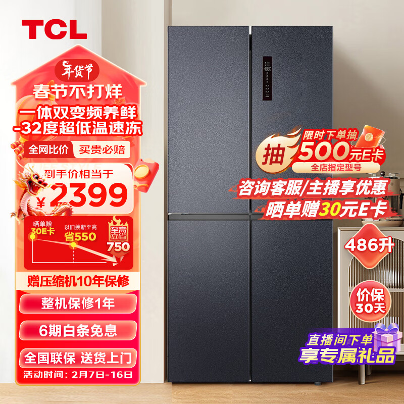 TCL 486升大容量养鲜冰箱十字对开门四开门双变频风冷无霜冰箱 一级能效 京东小家电冰箱BCD-486WPJD价格:2399.00元!