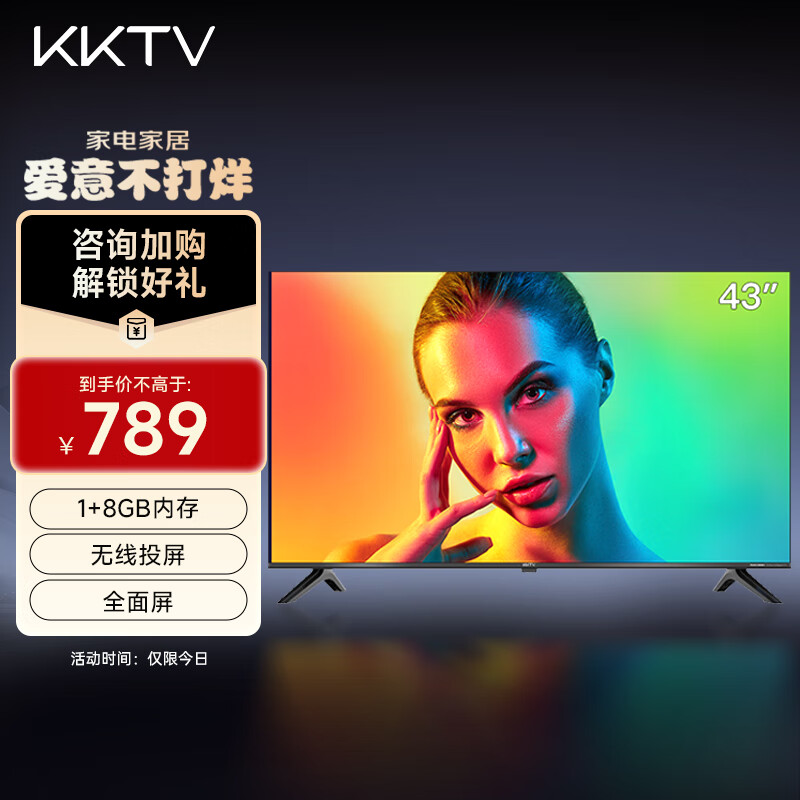 康佳KKTV K43 43英寸 1+8GB内存 全高清 屏 无线投屏 智能网络平板教育液晶电视机价格:789.00元!