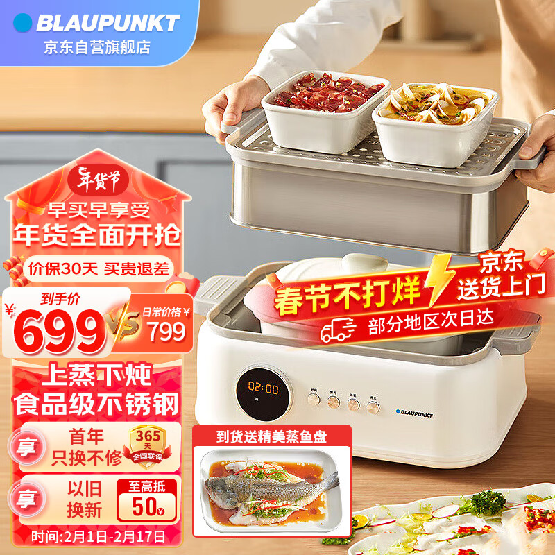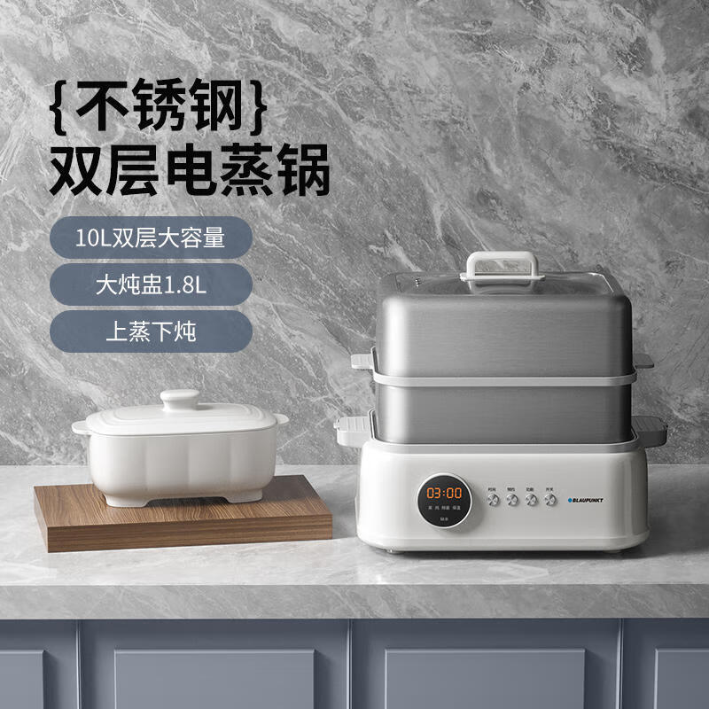 蓝宝(BLAUPUNKT)不锈钢电蒸锅蒸炖锅双层蒸笼多功能家用隔水炖盅全自动预约蒸汽蒸锅10L大容量 云朵白(含大炖盅)价格:699.00元!