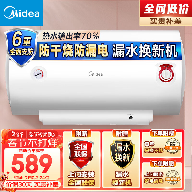 美的(Midea)热水器2100W速热耐用小体积 双重杀菌 升级加长防电墙全屋漏电预警40升电热水器F40-21WA1价格:589.00元!