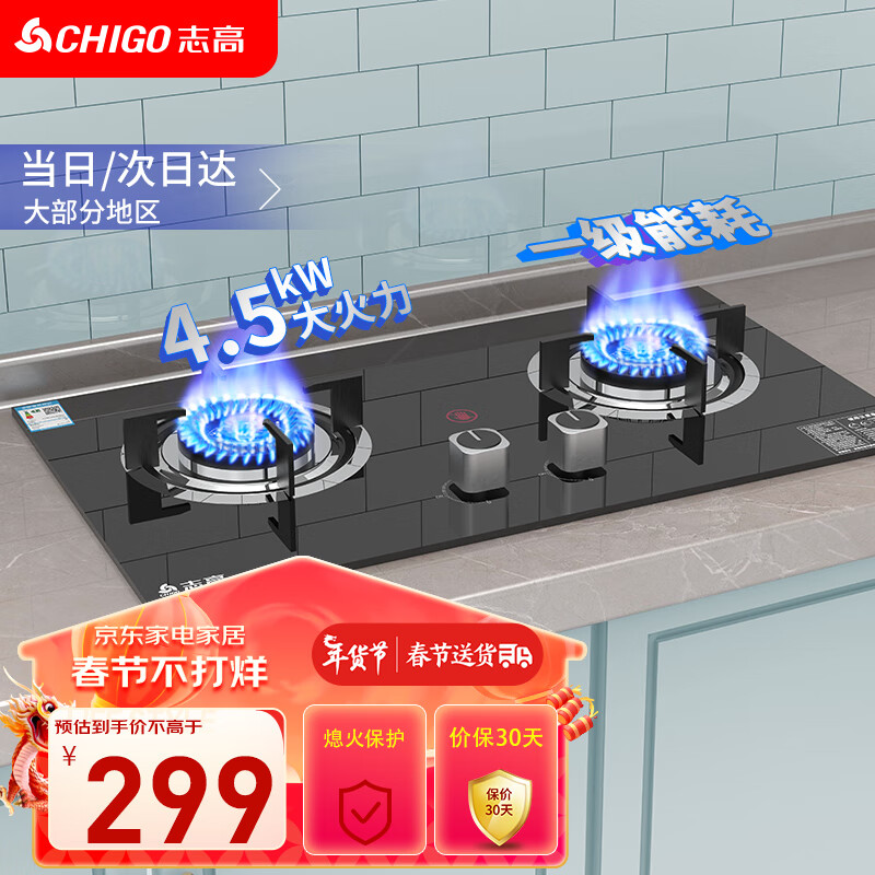 志高(CHIGO)燃气灶家用液化气煤气灶双灶节能升级4.5kW大火防爆钢化玻璃台嵌两用易清洗JZY-T130A价格:349.00元!