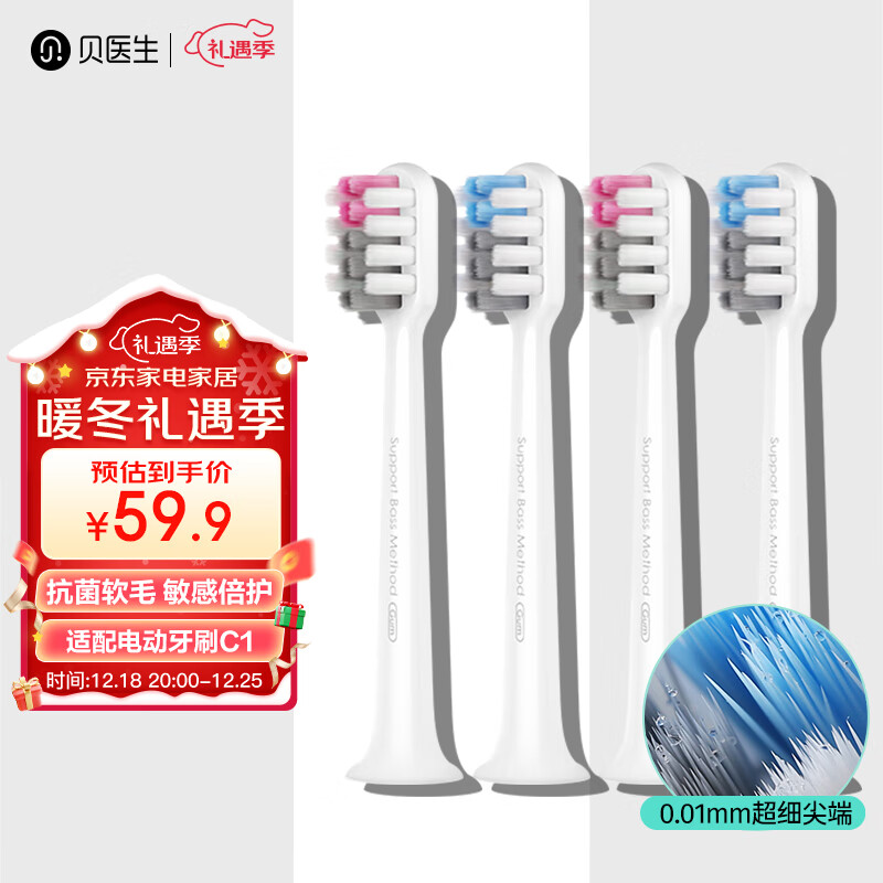 贝医生(DR·BEI) C1电动牙刷头替换刷头成人软毛小刷头进口护龈适配C1 清洁亮白护龈 敏感型【4支】价格:74.90元!