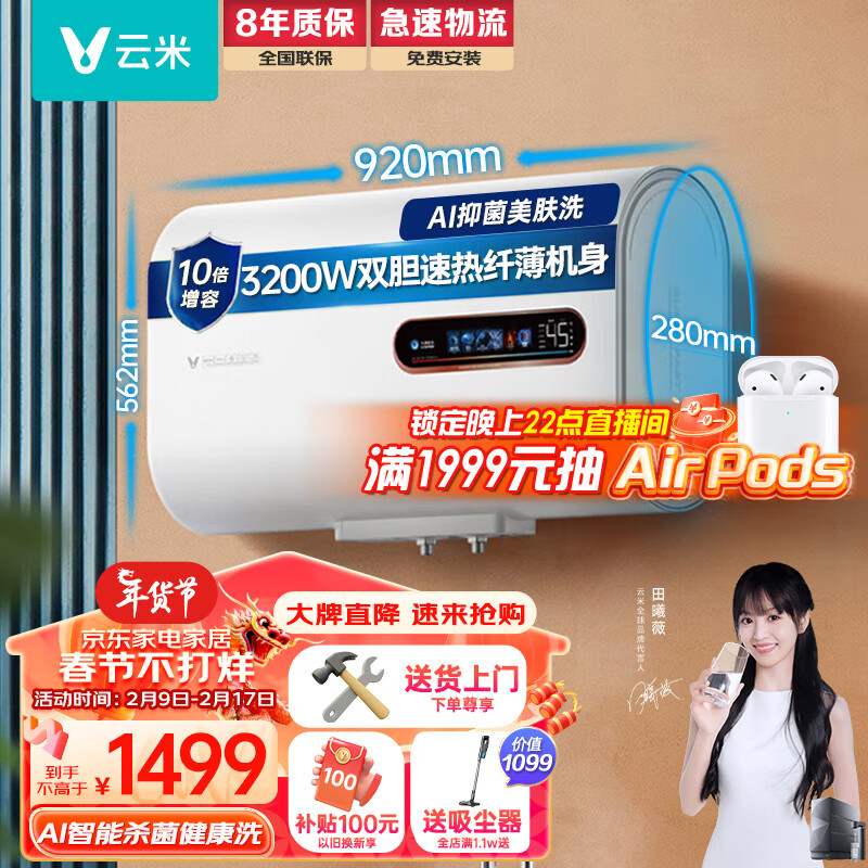 云米(VIOMI)电热水器Super 60升纤薄扁桶3200W双胆速热 家用储水式节能省电双重防护AI美肤洗VEW6022价格:1499.00元!
