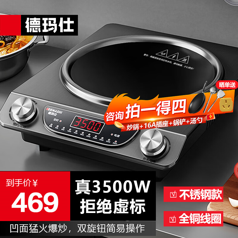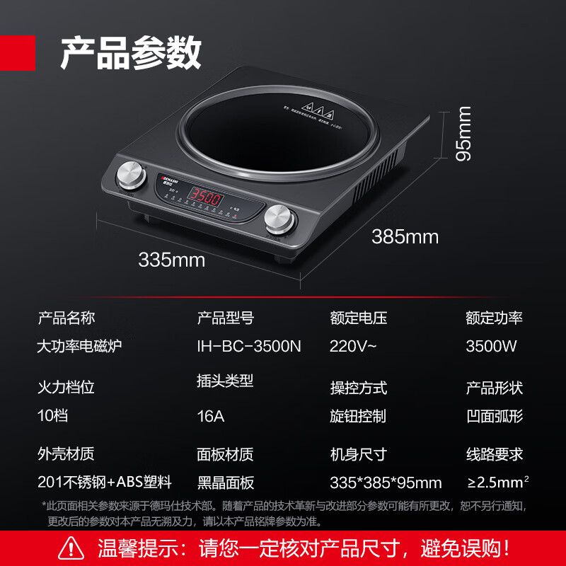 德玛仕(DEMASHI)3500W大功率商用电磁炉 凹面电磁炉家用炒菜带锅爆炒凹型 高端聚能电磁灶IH-BC-3500N价格:519.00元!