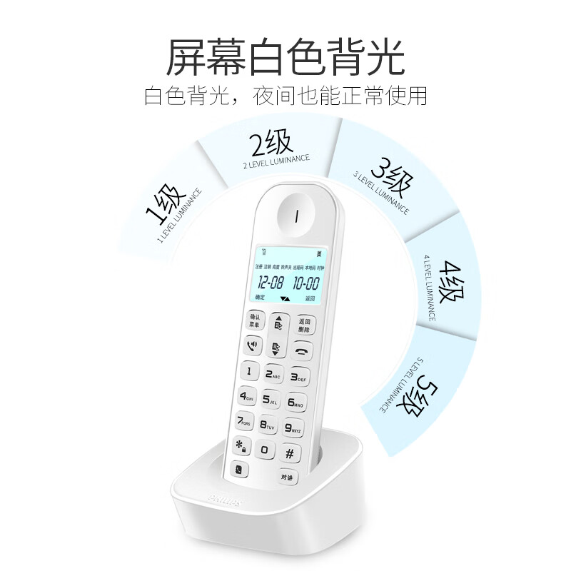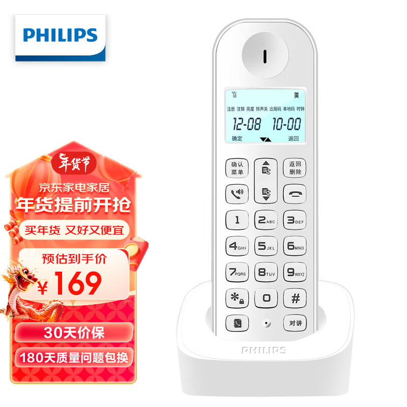 飞利浦(PHILIPS)数字无绳电话机/无线座机/单主机 白色屏幕背光 高清免提 家用办公 DCTG160(白色)价格:169.00元!