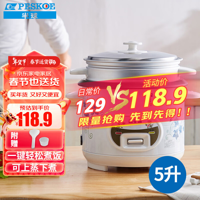 半球(Peskoe) 电饭煲5L电饭锅 家用直身电饭煲带蒸笼MW-DS50A1-G价格:118.90元!